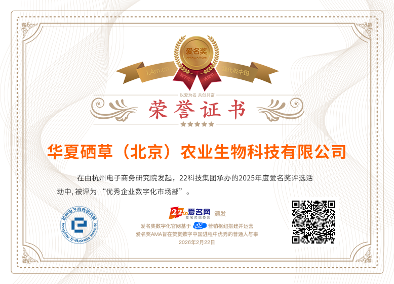 当前位置:爱名奖 > 优秀企业数字化市场部获奖名单>华夏硒草(北京)农业生物科技有限公司